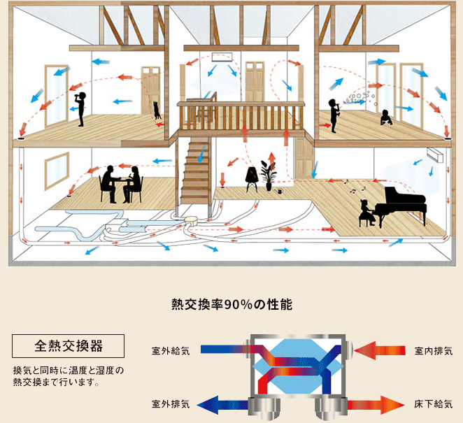 家庭から出す汚れた空気から、暖かさや、冷たさといった熱エネルギーを取り出し、その熱エネルギーを新しく取り入れる空気に加えます。こうすることにより、外気温による室内の温度変化を抑え、余計なエネルギーがかからなくなります。夏には温度差の交換で、蒸し暑さを防止し室内空気がサラリとしてエアコンは温度調整が軽減でき省エネにつながります。冬は温度差の交換で過乾燥防止になり、室内空気が適度にしっとりとして暖房温度が低く設定できるので、省エネにつながります。